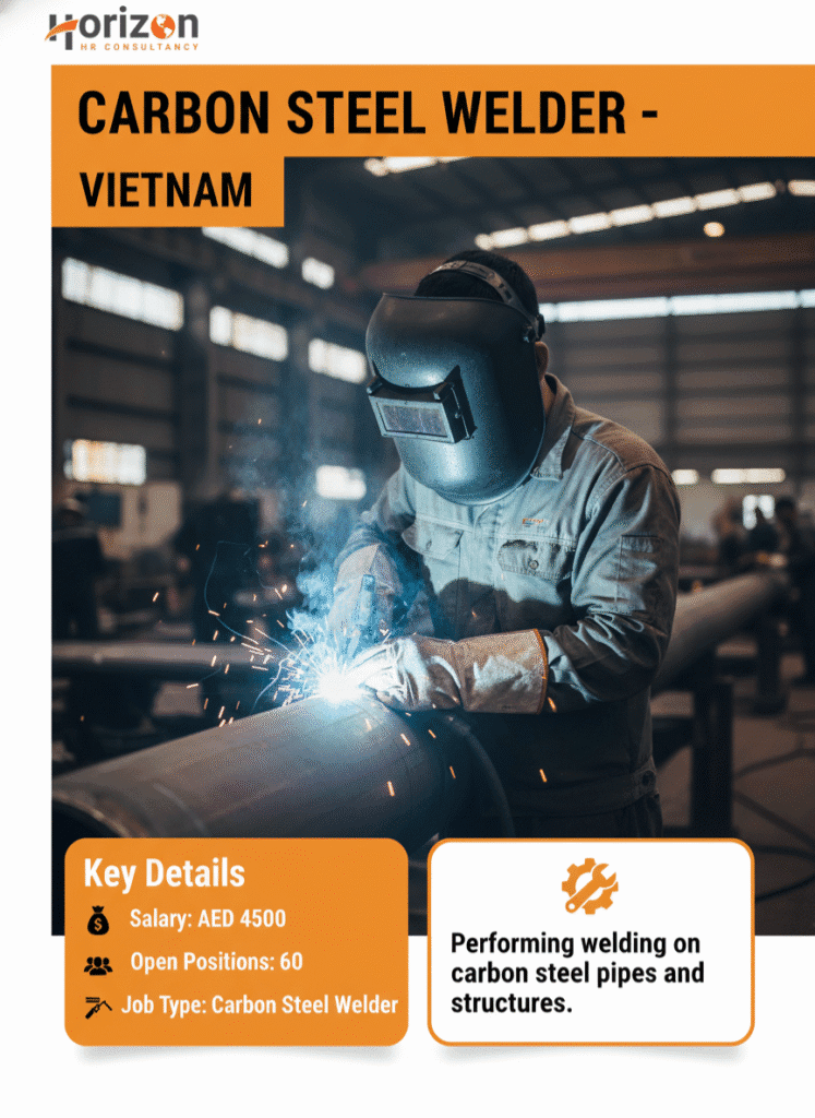 Carbon Steel WelderBy Horizonhrconsultancy / November 20, 2025 Carbon Steel Welder – VietnamSalary: AED 4500Open Positions: 60Job Type: Carbon Steel WelderDescription: Performing welding on carbon steel pipes and structures.Job Category: WelderJob Type: Full TimeJob Location: Vietnam Apply for this positionFull Name *Email *Phone *Cover Letter *Upload CV/Resume *Allowed Type(s): .pdf, .doc, .docxBy using this form you agree with the storage and handling of your data by this website. *