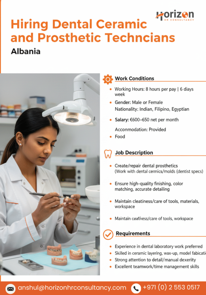 We are hiring 2 Dental Ceramic and Prosthetic Technicians for a reputed dental laboratory in Albania. The role involves creating and repairing dental prosthetics with precision, artistry, and attention to detail.