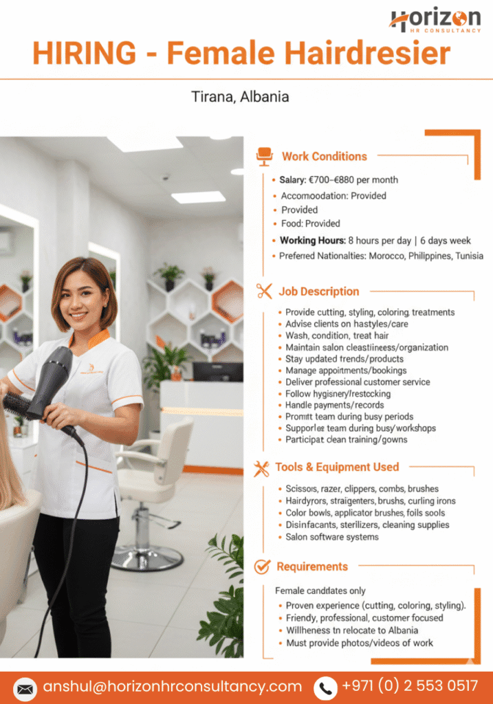 We are hiring talented and creative Female Hairdressers to join a professional beauty salon located in the center of Tirana, Albania. If you are skilled, passionate about hairstyling, and dedicated to excellent customer service — this opportunity is for you.