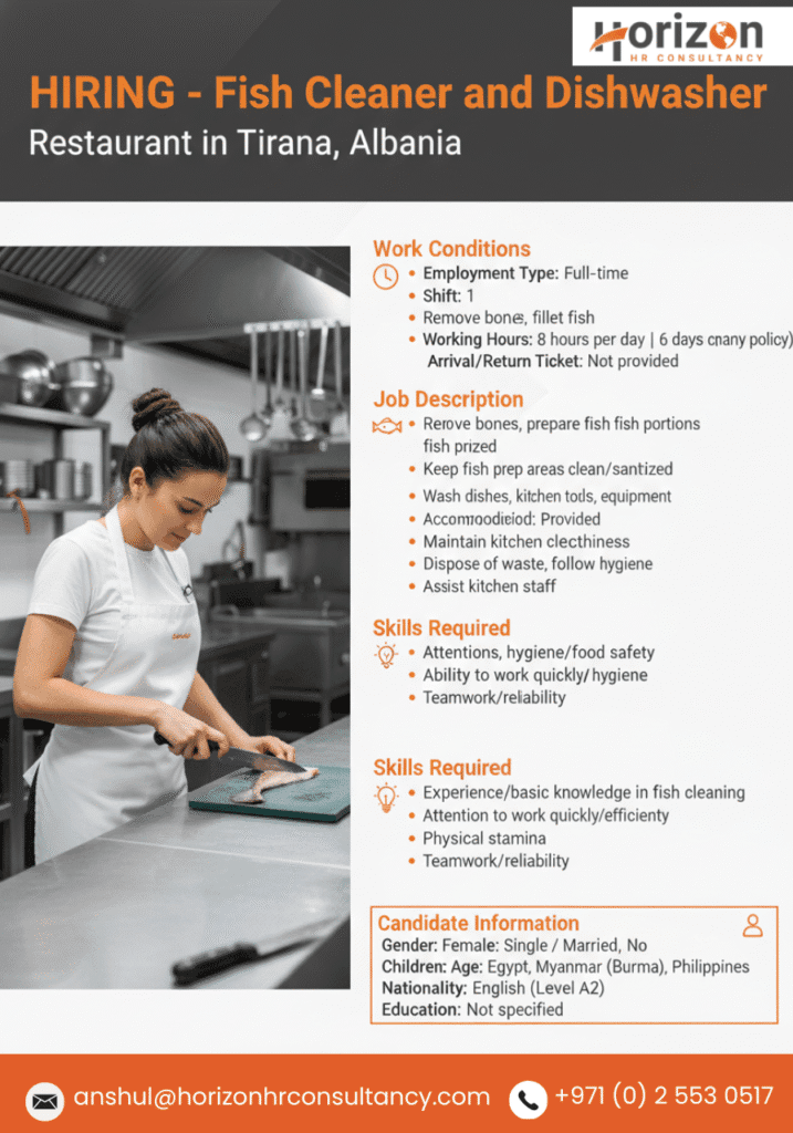 We are hiring a Fish Cleaner and Dishwasher for a reputed restaurant in Tirana, Albania.