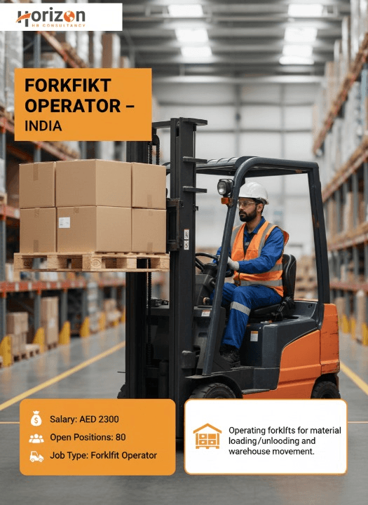 Forklift OperatorBy Horizonhrconsultancy / November 20, 2025 Forklift Operator – IndiaSalary: AED 2300Open Positions: 80Job Type: Forklift OperatorDescription: Operating forklifts for material loading/unloading and warehouse movement.Job Category: Forklift OperatorJob Type: Full TimeJob Location: india Apply for this positionFull Name *Email *Phone *Cover Letter *Upload CV/Resume *Allowed Type(s): .pdf, .doc, .docxBy using this form you agree with the storage and handling of your data by this website. *