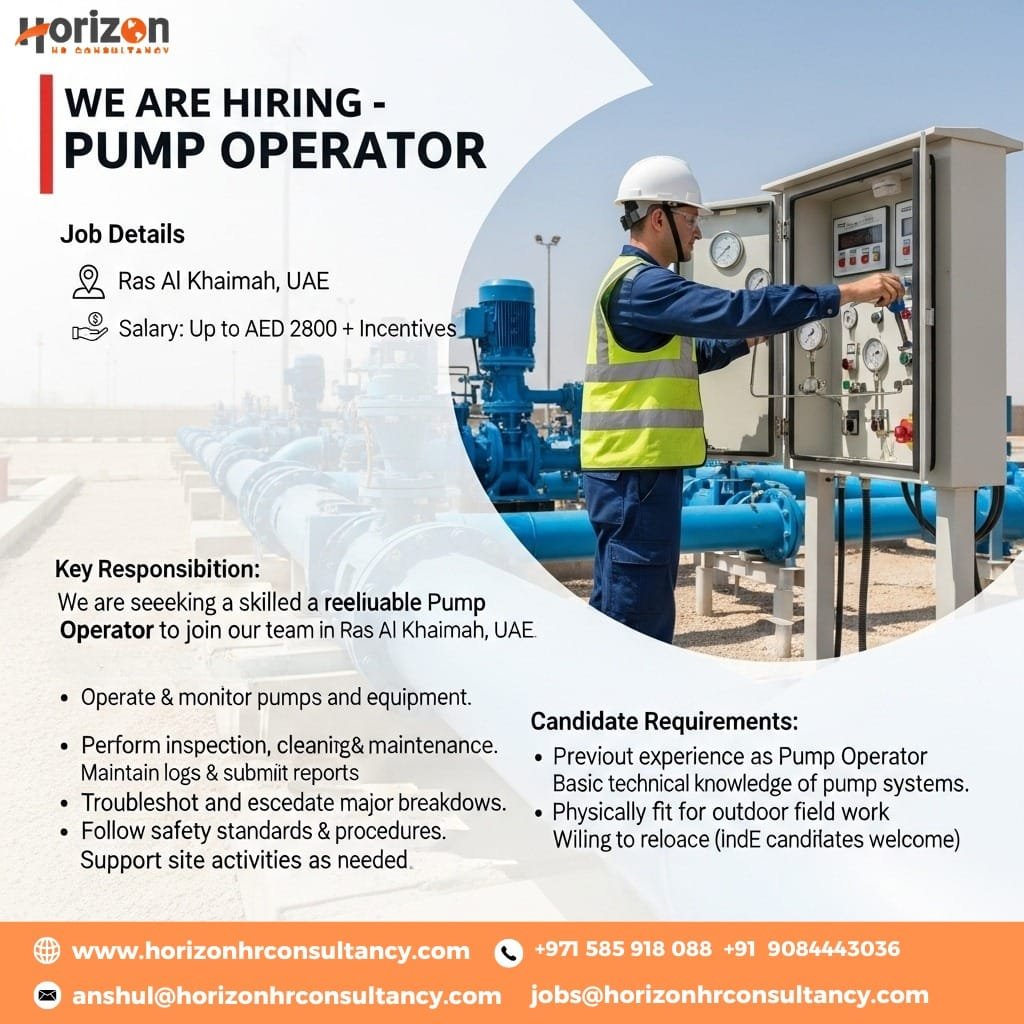 We are seeking a skilled and reliable Pump Operator to join our team in Ras Al Khaimah, UAE. The candidate will be responsible for safe pump operation, preventive maintenance, and ensuring smooth daily site functions.